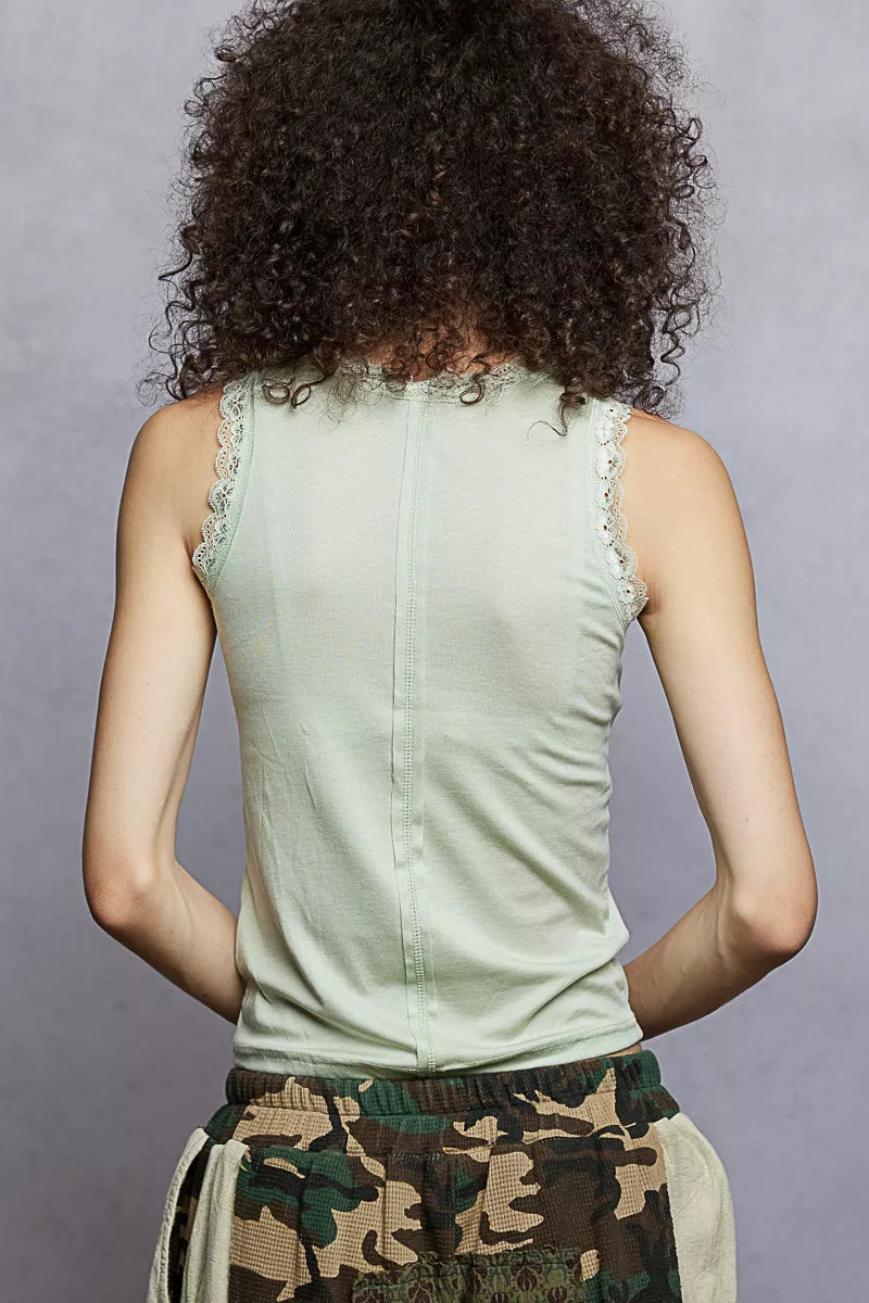 This top features a round neck and a fitted sleeveless silhouette, made from comfortable jersey fabric. It is adorned with elegant lace trim details. The design offers a sleek and flattering fit. Perfect for layering or wearing on its own, this top is versatile for various occasions.